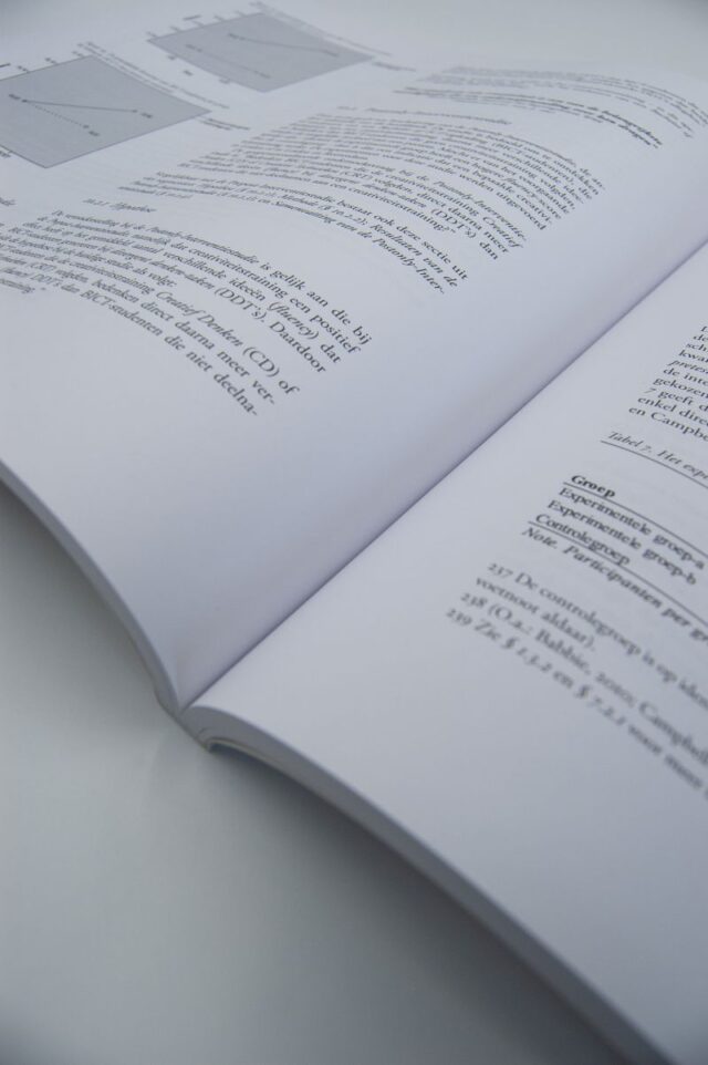 De uitstraling van je gedrukte proefschrift is mede afhankelijk van het papier dat gebruikt wordt. Zo is het voor een proefschrift dat alleen uit tekst bestaat verstandig om te kiezen voor mat HVO papier, of voor roomwit papier zoals Romandruk. Als er veel afbeeldingen in je proefschrift voorkomen dan is het  vaak juist beter om te gaan voor bijvoorbeeld een Silk papiersoort, omdat illustraties en foto’s daarop beter tot hun recht komen. Het is verstandig om even met ons te overleggen welke papiersoort jouw proefschrift het meest tot haar recht laat komen. Wij willen je hier graag over adviseren, zodat we samen tot het best haalbare resultaat komen.