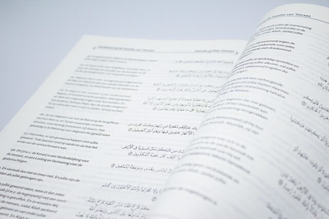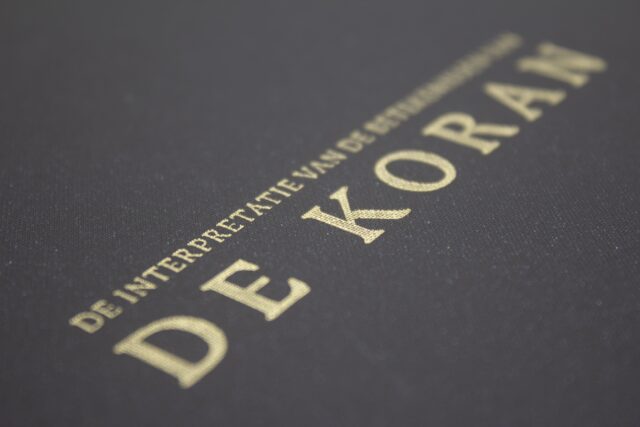 Dit hardcover boek is het heilige boek van de Islam, de Nederlandse vertaling van de Koran. De leesrichting van dit boek is van rechts naar links, dus dit vereist extra aandacht bij het drukken.