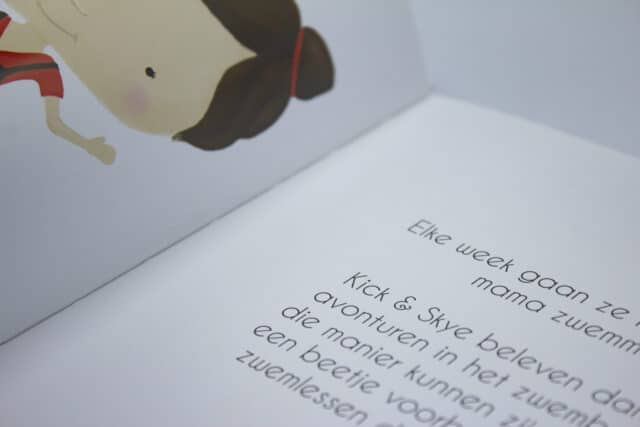 Dit hardcover kinderboek is genaaid gebonden en heeft een rechte rug