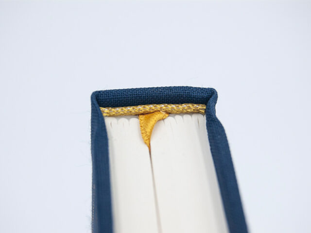 Op een boek met linnen omslag kan je de titel in folie laten drukken en het is zelfs mogelijk meerdere kleuren folie te gebruiken, zoals bij dit prachtig uitgevoerde boek met blauw linnen en witte en gouden foliedruk.