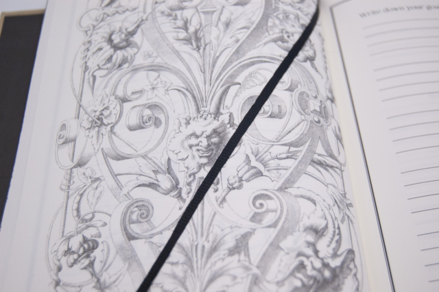 De cover is van linnen, een materiaal dat het journal een luxe uitstraling geeft. Zowel het leeslintje, de schutbladen en de tekst op de cover zijn zwart. Hiermee creëer je eenheid en rust. Door middel van je kleurkeuze kun je een andere uitstraling creëren.